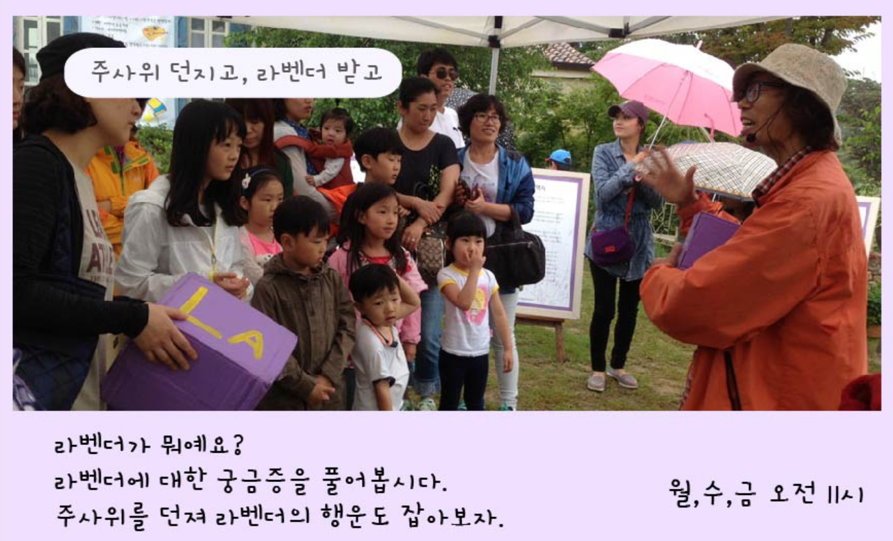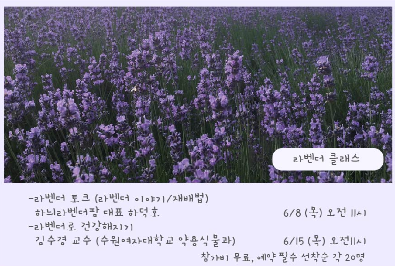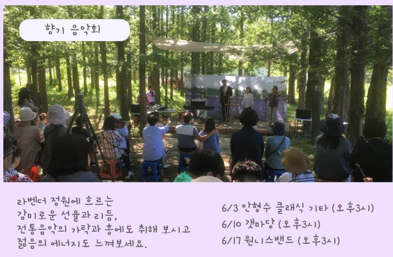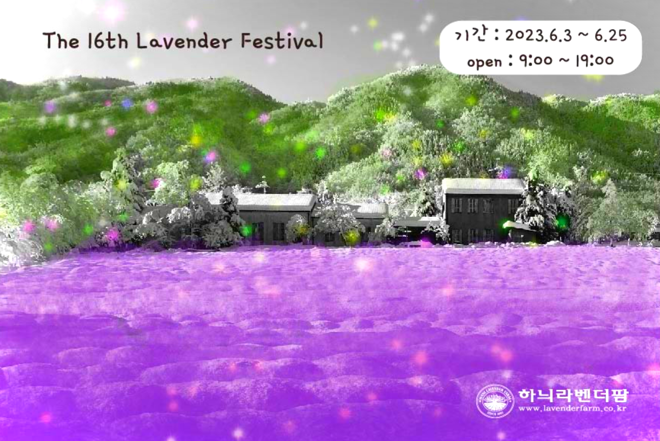라벤더 시즌인 6월간 6/3(토)부터 6/25(일)까지 09:00~19:00이고, 휴무는 없으며, 주의사항으로 반려동물 동반 및 드론 촬영 금지 등의 사항이 있다. 관련 내용은 아래를 참고한다.