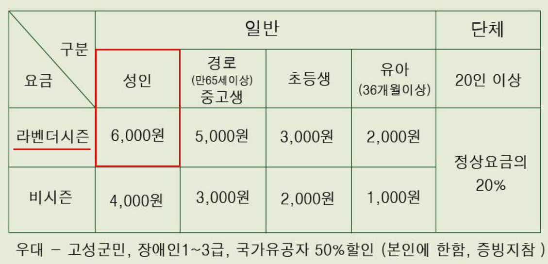 입장료는 라벤더시즌의 성인 기준으로 6,000원 운영하고 있으며, 단체(20명 이상시) 정상요금의 20%를 할인해 준다. 자세한 내용은 아래 내용을 참고한다.