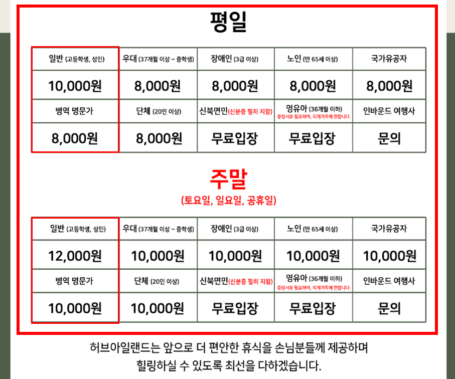 입장료가 인건비 및 자재비 상승으로 인해 최근 인상되었다고 하니, 아래 최신화 부분을 참고한다. 평일과 주말/공휴일에 다른 입장료로 운영하며, 일반인 기준 10,000원(평일), 12,000원(주말/공휴일)이다. 20명이상의 단체로 투어시 할인되는 방법 및 아래 대상별로 다소 다른부분이 있으니 자세한 부분은 아래 캡처본을 참고한다.